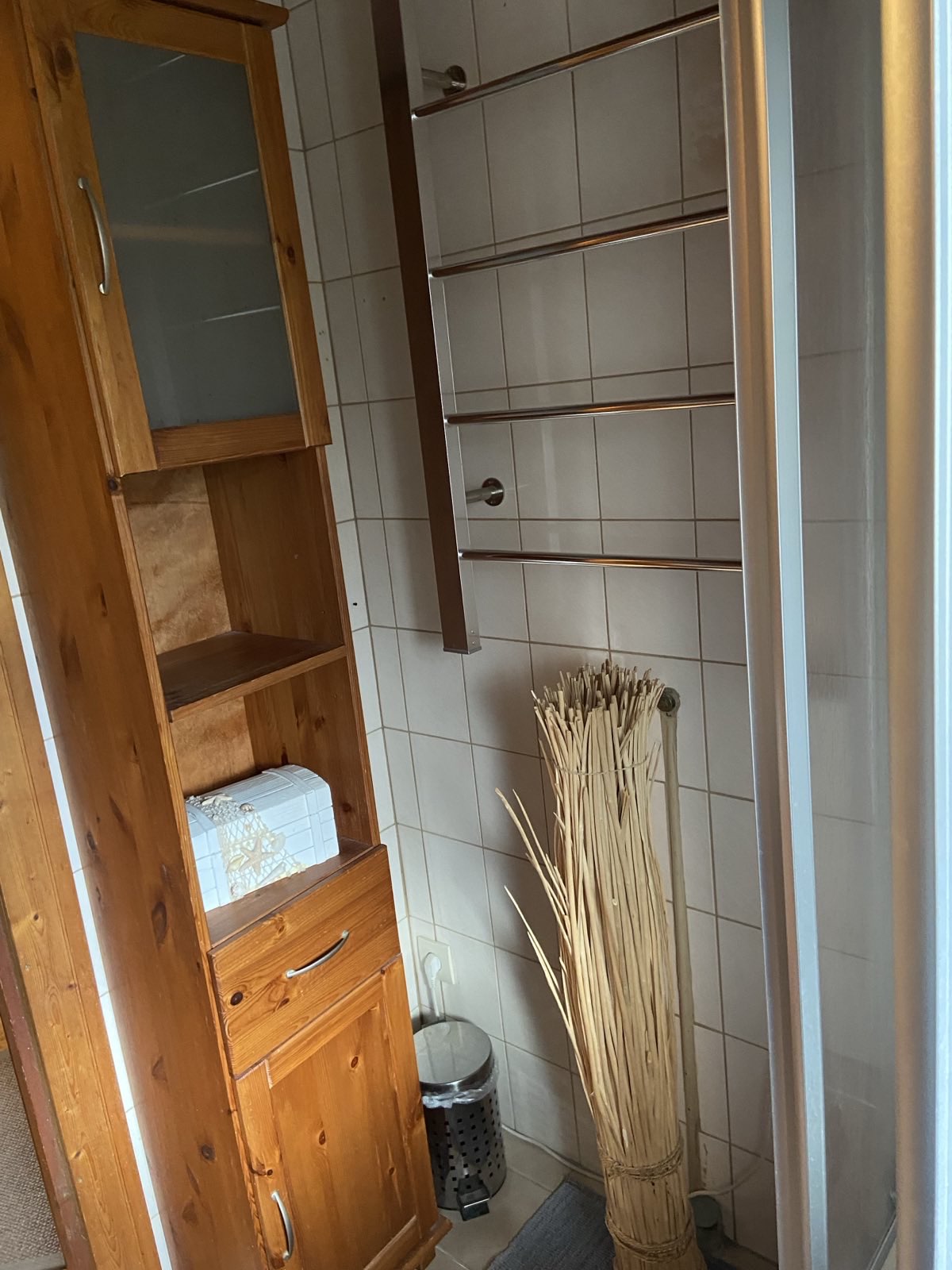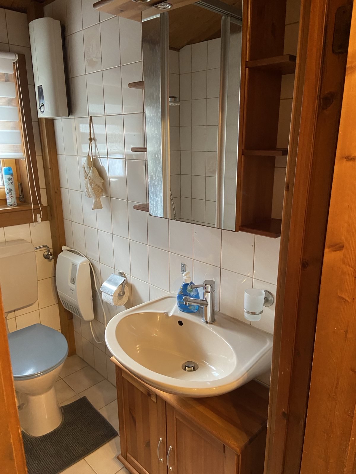Unser Bad ist ausgestattet mit Waschbecken, Dusche und WC sowie einem Handtuchheizkörper, der für trockene und warme Handtücher sorgt. Duschvorleger sind vorhanden und liegen im Regal bereit.